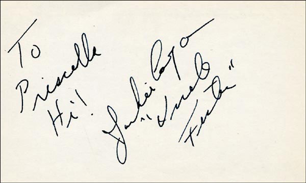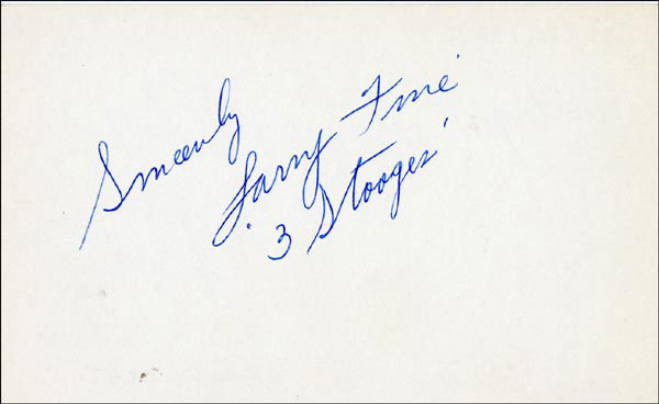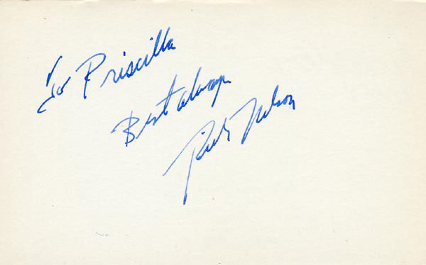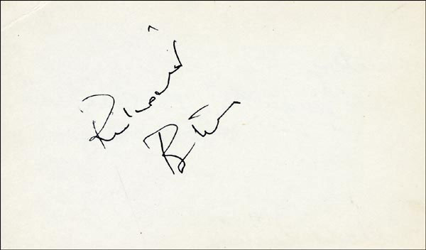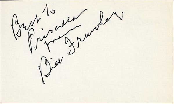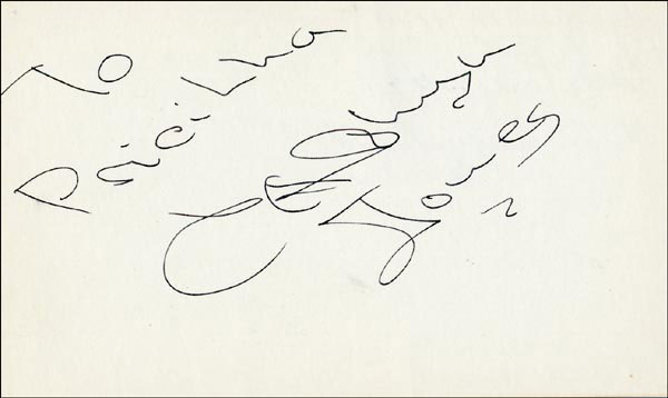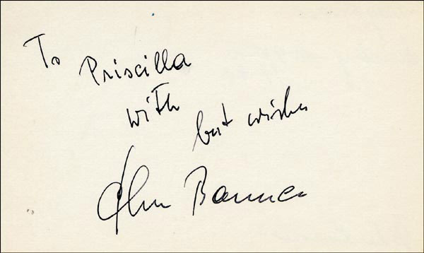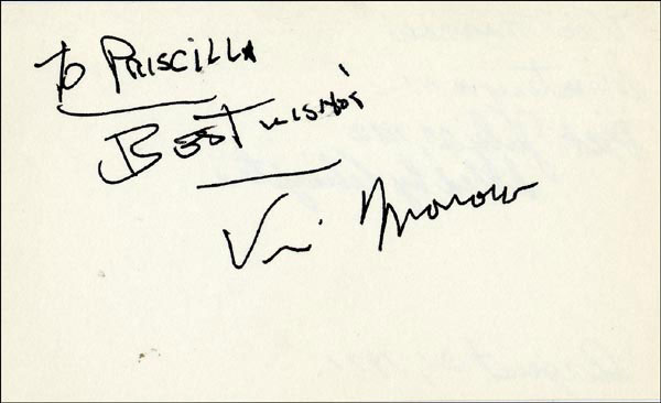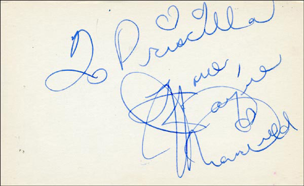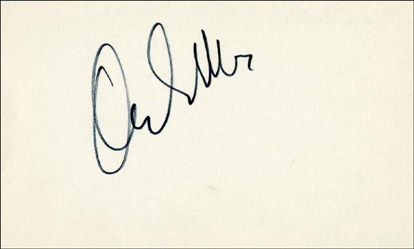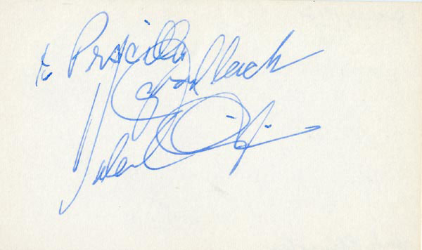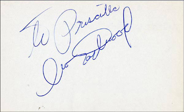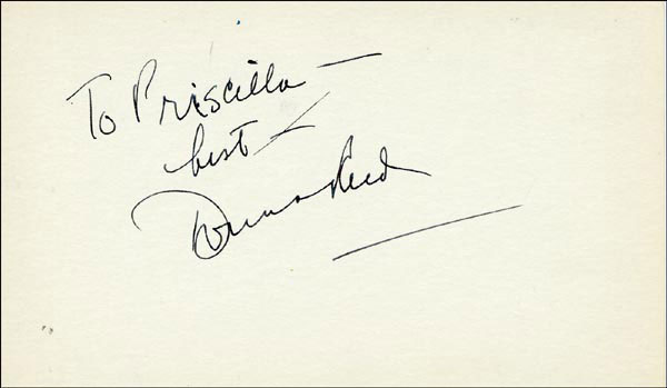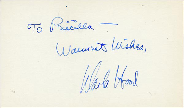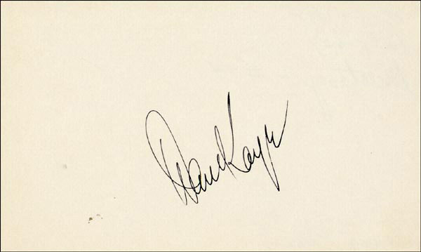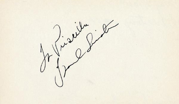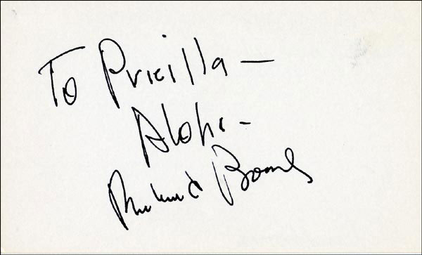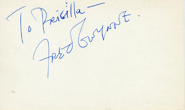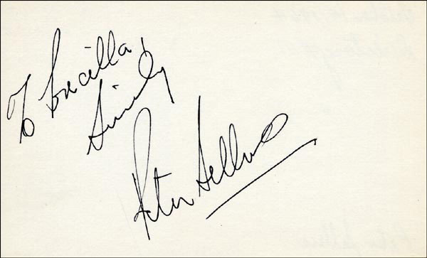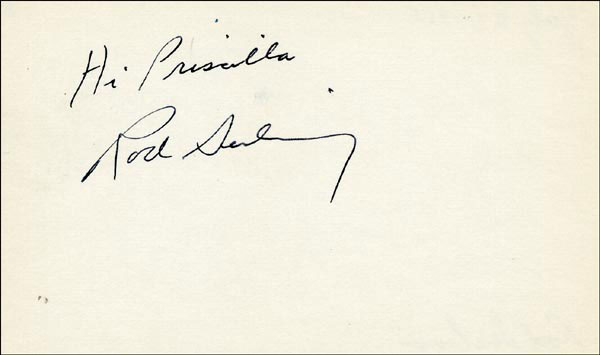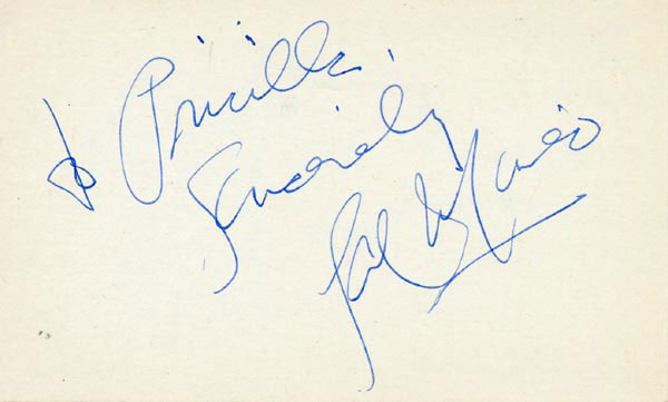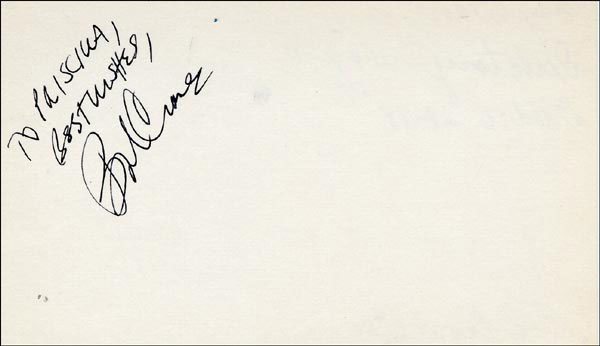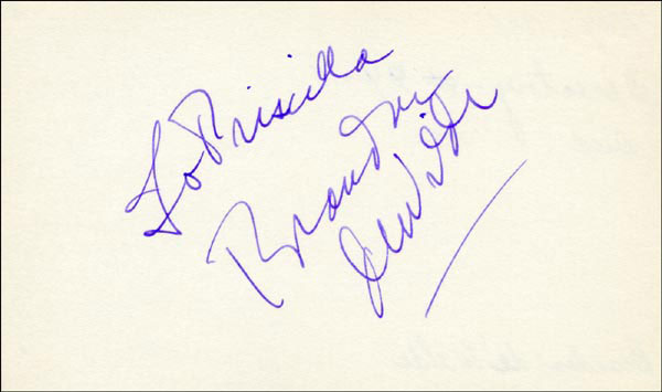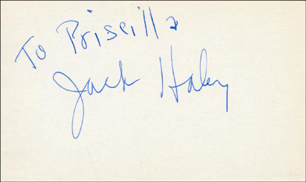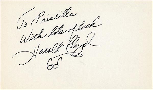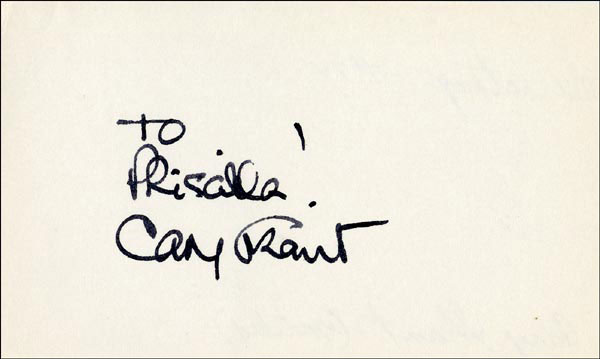 Approximately 2200 ballpoint and ink signatures on individual off-white 5 x 3 cards, acquired in New York City and Hollywood from 1960-1975. Many of the signers have inscribed to Priscilla, with many of the inscriptions able to be matted out. A small sampling of the signers includes: Woody Allen, Frankie Avalon, Ursula Andress, Pier Angeli, Paul Anka, Desi Arnaz, Jim Backus, Lucille Ball, Anne Bancroft, John Banner, Frances Bavier, Anne Baxter, Ed Begley, Ralph Bellamy, Bea Benadaret, Joan Bennett, Brigitte Bardot, Freddie Bartholomew, Richard Basehart, Neville Brand, Walter Brennan, Edgar Bergen, Milton Berle, Carl Betz, Barbara Billingsly, Raymond Burr, Pat Buttram, Jim Brown, Edgar Buchanan, Victor Buono, Sebastian Cabot, Michael Caine, Rory Calhoun, Fred Clark, Petula Clark, Judy Carne, Art Carney, Leslie Caron, John Carradine, Johnny Carson, John Cassavetes, Jack Cassidy, Richard Chamberlain, Lee. J. Cobb, Steve Cochran, James Coco, Ellen Corby, Robert Conrad, William Conrad, Claudette Colbert, Tim Conway, Jackie Coogan, Julie Christie, Michael Cole, Dan Dailey, Blythe Danner, Ray Danton, Kim Darby, Denise Darcel, Bobby Darin, Linda Darnell, Jeannie Crain, Bob Crane, William Demarest, John Derek, Brandon de Wilde, Billy deWolfe, Bradford Dillman, Troy Donahue, Richard Deacon, Yvonne DeCarlo, Sandra Dee, Olivia deHavilland, Albert Dekker, Gabriel Dell, Dolores Del Rio, Clint Eastwood, Nelson Eddy, Barbara Eden, Jack Elam, Wild Bill Elliott, Ron Ely, Faye Emerson, Kirk Douglas, Patty Duke, Dale Evans, Chad Everett, Fabian, Mia Farrow, Alice Faye, Frank Faylen, Norman Fell, Barbara Feldon, Peter Finch, Larry Fine, Albert Finney, William Frawley, Joe Flynn, Betty Grable, Gloria Grahame, Elizabeth Hartman, Judy Holliday, Darla Hood, Bob Hope, Jill Ireland, Burl Ives, Richard Jaeckel, Sam Jaffe, David Janssen, Russell Johnson, Van Johnson, Carolyn Jones, Werner Klemperer, Jack Klugman, Don Knotts, Ruby Keeler, Brian Keith, Sally Kellerman, George Kennedy, Veronica Lake, Burt Lancaster, Elsa Lanchester, Michael Landon, George Lazenby, Jack Lemmon, Lotte Lenya, Harold Lloyd, Richard Long, Jack Lord, Peter Lorre, Tina Louise, Paul Lukas, Keye Luke, Paul Lynde, Carol Lynley, Sue Lyon, Marie McDonald, Dean Martin, Mary Martin, Ross Martin, James Mason, Marilyn Maxwell, Virginia Mayo, Jock Mahoney, Karl Malden, Dorothy Malone, David Manners, Jayne Mansfield, Zero Mostel, George Murphy, Audrey Meadows, Jayne Meadows, Burgess Meredith, Toshiro Mifune, Ray Milland, J. Carroll Nash, Alan Napier, Anna Neagle, David Nelson, Barbara Nichols, David Niven, Sheree North, Kim Novak, Simon Oakland, Margaret O'Brien, Arthur O'Connell, Donald O'Connor, Susan Oliver, Ryan O'Neal, Jennifer O'Neal, Maureen O'Sullivan, Peter O'Toole, Geraldine Page, Jack Palance, Robert Palmer, Fess Parker, Barbara Parkins, Larry Parks, Michael Parks, John Payne, Alice Pearce, Gregory Peck, George Peppard, Mary Pickford, Edward Platt, Donald Pleasance, Suzanne Pleshette, Christopher Plummer, Sidney Poitier, Eleanor Powell, Stephanie Powers, Pat Priest, George Raft, Claude Rains, Joe E. Ross, Tony Randall, Robert Redford, Christopher Reeve, Tommy Rettig, Diana Rigg, Tex Ritter, Jason Robards, Pernell Roberts, Gena Rowlands, Ann Rutherford, Margaret Rutherford, Cliff Robertson, Edward G. Robinson, Buddy Rogers, Ginger Rogers, George Sanders, Telly Savalas, Natalie Schaefer, Paul Scofield, Walter Slezak, Elke Sommer, Robert Stack, Barbara Stanwyck, Randolph Scott, Zachary Scott, Peter Sellers, Phil Silvers, Penny Singleton, Omar Sharif, William Shatner, Robert Shaw, Dick Shawn, Norma Shearer, Martin Sheen, Ann Sheridan, Rod Steiger, Milburn Stone, Larry Storch, Barbra Streisand, Woody Strode, Sally Struthers, William Talman, Jessica Tandy, Sharon Tate, Roy Thinnes, Terry Thomas, Pamela Tifflin, George Tobias, Arthur Treacher... and many more! An incredible collection in overall fine condition. A complete list is available and the lot may also be viewed by appointment at the R&R offices in Bedford, NH. R&R COA.