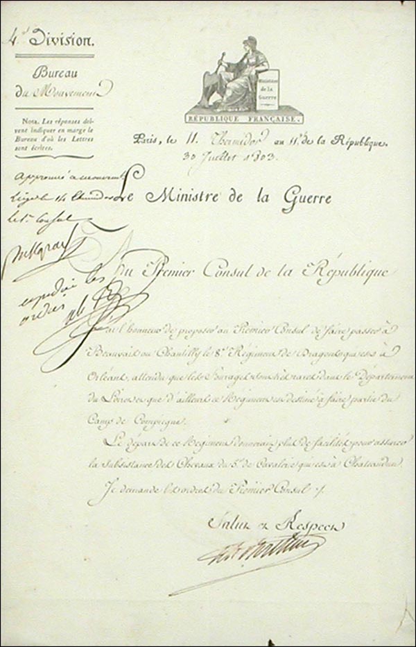 Endorsement, signed 'Bonaparte, on a one page 8 x 12.5 letter from the Minister of War Berthier, dated July 30, 1803, addressed to Bonaparte. Letter is a petition from Berthier to transfer the 8th Dragonerregiment to Beauvais or Chantilly due to the lack of food. Napoleon approves the request, signing on the left side of the letter under 'approve a mouvement.' Matted and framed to an overall size of 14 x 19. In fine condition, with a few small edge dings and expected folds. COA John Reznikoff/PSA/DNA and RRAuction COA.