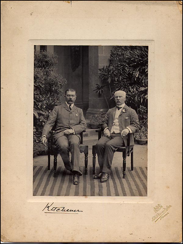 British field Marshall and secretary of state for war in WWI. Vintage matte-finish 6.25 x 8 photo affixed to its original 9.75 x 12 mount, showing Kitchener sitting with another gentleman signed on the mount in fountain pen, 'Kitchener.' In fine condition, with some scattered soiling and edge dings to mount. RRAuction COA.