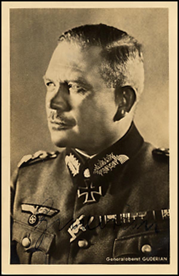 Promoted to General der Panzertruppen and on the outbreak of war was given command of the Nineteenth Corps, which he led in the Polish Campaign. For the battle of France he was given a Panzer group, and his brilliant handling was a perfect demonstration of the concept of blitzkrieg -rapid armored breakthrough, supported by air power, on a narrow front- which he had propagated in his writings. Vintage 3.5 x 5.5 Hoffmann postcard photo, signed in fountain pen, 'Guderian.' In fine condition, with some light contrast to signature. RRAuction COA.