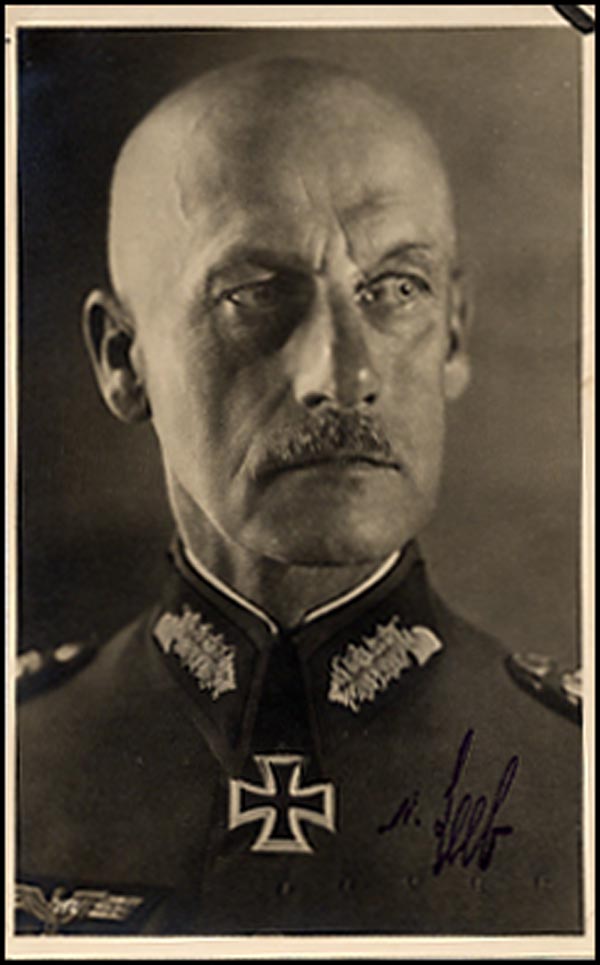 General Field Marshall; commanded Army Group C on the Western Front during 1940 but resigned over differences with Hitler; died in 1956. Vintage 3.5 x 5.5 postcard photo, signed in fountain pen, 'v. Leeb.' In fine condition, with mounting remnant to top right corner. RRAuction COA.