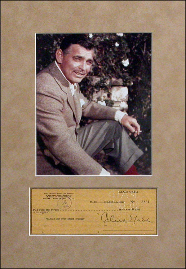 Check, 8.25 x 3.25, filled out in type and signed by Gable, payable to Francis-Orr Stationery Company for $5.69, October 10, 1946, suede- matted with a great color glossy 7.5 x 9.5 portrait of Gable to an overall size of 12 x 18. In fine condition, with usual cancellation holes and stamps, none touching the very clean signature area. R&R COA.