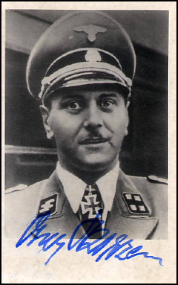 Knights Cross winner and Nazi Elite Guard colonel famous for rescuing Mussolini; he died in 1975. Impressive 3.5 x 5.5 cardstock photo of Skorzeny in uniform, signed in blue felt tip. In fine condition, with a light horizontal crease through facial area and some minor light soiling. RRAuction COA.