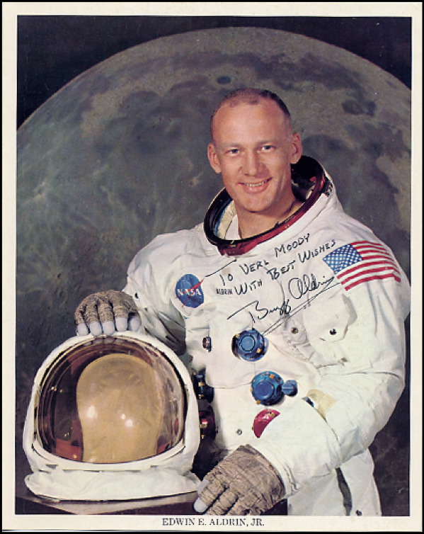 Color 8 x 10 NASA photo of Aldrin in his spacesuit against a lunar backdrop, signed and inscribed in black felt tip 'To Veryl Moody, With best wishes, Buzz Aldrin.' In fine condition. RRAuction COA.