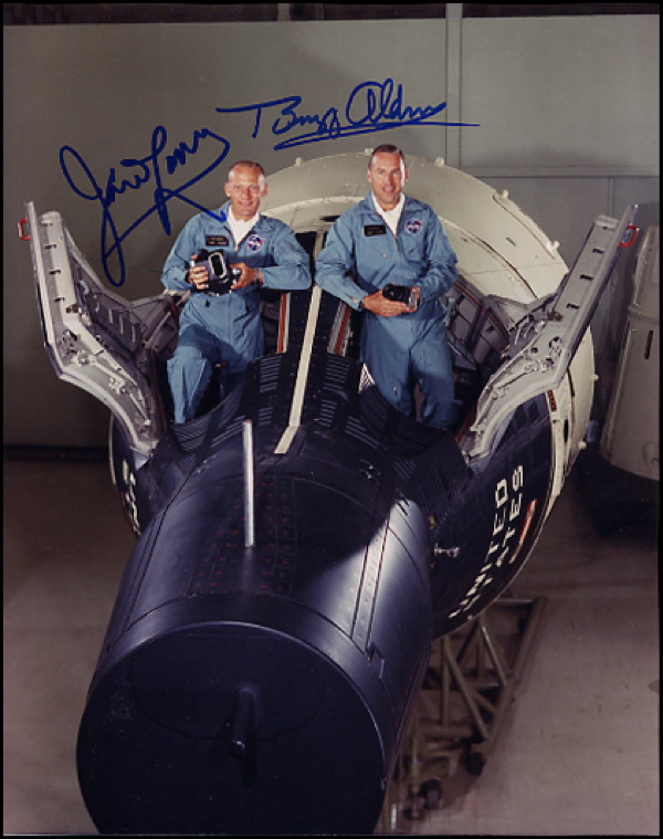 Color satin-finish 8 x 10 photo of Buzz Aldrin and James Lovell posing inside their capsule, signed in blue felt tip by Aldrin and Lovell. In fine condition. RRAuction COA.