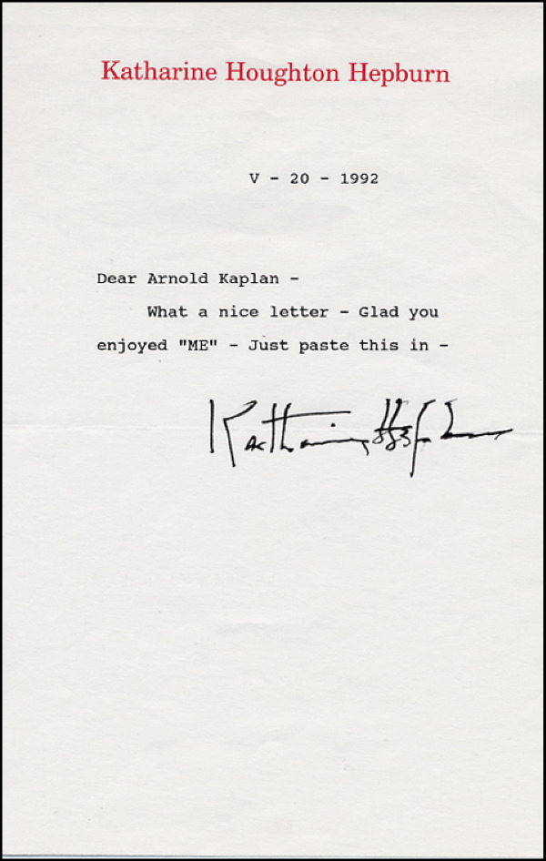 TLS, one page, 5.5 x 8.5, Katharine Houghton Hepburn letterhead, May 20, 1992. In full: “Dear Arnold Kaplan - What a nice letter - Glad you enjoyed ‘ME’ - Just paste this in -” In fine condition, with a light horizontal fold through the signature. R&R COA.