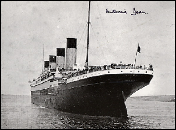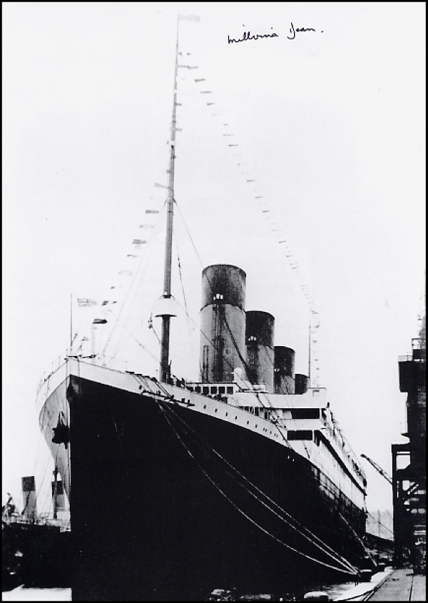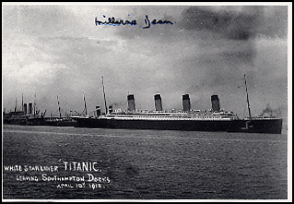 Oldest Titanic survivor. Lot of three signed photos. Glossy 8 x 12 photo of the Titanic and two different 6 x 4 postcard photos, each signed in black felt tip by Dean. In fine condition. RRAuction COA.
