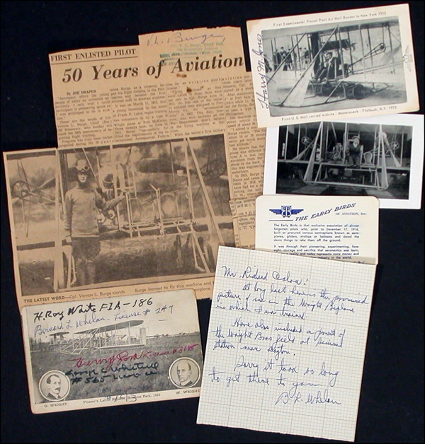 Lot of six signed items from the 'Early Birds of America,' all of whom piloted a Wright Brothers plane. Centerpiece of this group is a vintage 5.5 x 3.5 postcard photo bearing small portrait of Orville and Wilbur Wright, entitled 'Pioneer's Latest Biplane, Belmont Park, 1910,' signed on the front in ink and ballpoint by aviation pioneers H. Roy Waite, Bernard L. Whelan, Henry Dora, George C. Whiting and W. Norman Brown, with all five adding their license number. Also included in the lot are: a 4 x 2.5 Early Birds of Aviation card signed in blue ballpoint by Waite, an undated one page ALS from Bernard Whelan, mentioning the 'Wright biplane in which I trained,' a glossy 5 x 3 glossy photo of Henry Dora standing in front of his Wright plane, signed on the reverse, with Dora adding his career highlights, a newspaper clipping of Vernon L. Burge standing in front of his Type B Wright flying machine, signed in blue ballpoint and a 5.25 x 3.5 of Harry M. Jones sitting in a Wright plane, signed in black ink by Jones. In fine overall condition. RRAuction COA.