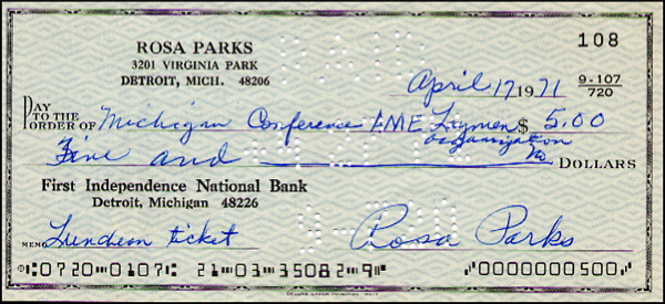 Personal check, 6 x 2.75, filled out and signed by Parks, payable to Michigan Conference A.M.E. Lay Organization for 5.00, April 17, 1971. A note in the memo section reads 'Luncheon.' In fine condition, with usual cancellation holes and stamps, with holes touching the first name of the signature, a vertical fold not in the signature area. RRAuction COA.
