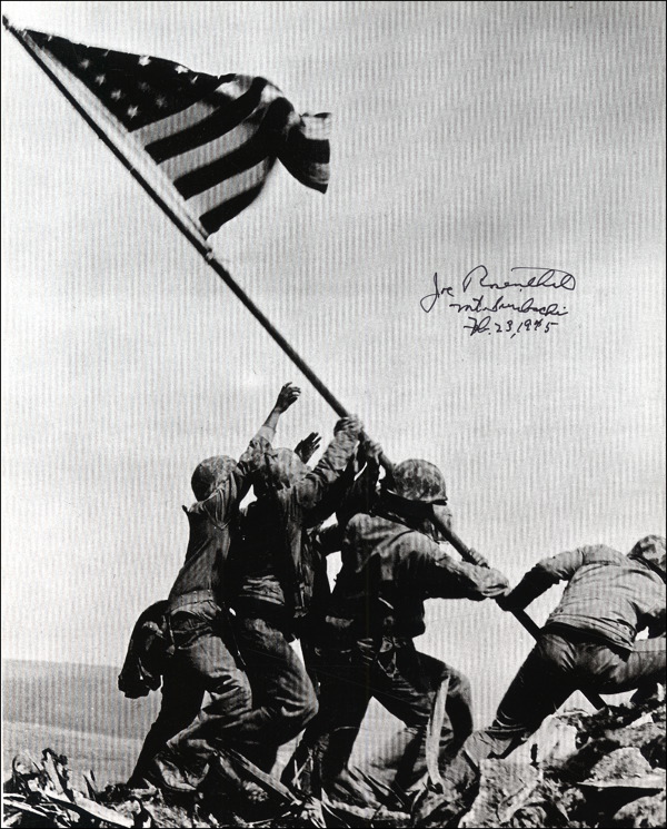 Photographer best known for his famous shot of five Marines raising the flag on Iwo Jima. Famous 10 x 12.75 reproduction copy of the flag raising on Mount Suribachi after the battle of Iwo Jima, signed in black felt tip, 'Joe Rosenthal, Mt. Suribachi, February 23, 1945.' In fine condition. Uncommon in this size. Accompanied by an unsigned typescript copy of the story of the photograph, as told by Rosenthal, titled The Picture That Will Live Forever. RRAuction COA.