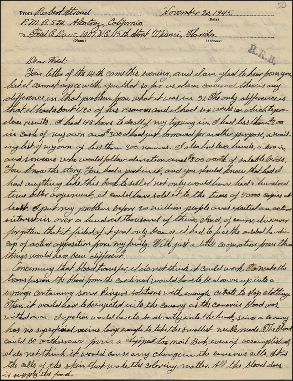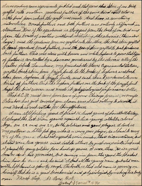 The Birdman of Alcatraz. Imprisoned for murder at age 18, Stroud spent over 54 years in jail (47 of them in isolation!) where he became a self-educated authority on canaries and bird diseases, publishing Stroud's Digest of the Diseases of Birds in 1942. Also a self-taught legal scholar, Stroud wrote an exhaustive history of the federal legal system. ALS signed 'Robert Stroud number 594,' one lined page both sides, 8 x 10.25, November 20, 1945; he also writes his name on the top of the first page. Interesting, lengthy discourse with great bird content, and with great detail on feathers. In part: 'Concerning that blood transfer, I do not think it could work. To make the transfusion the blood from the cardinal would have to be drawn up into a syringe containing some Ringers solutions with enough citrate to stop clotting. Then it would have to be injected into the canary as the canaries blood was withdrawn...Breast feathers and back feathers are entirely different in structure...if the epidermis is stripped from the back of one bird and from the breast of another without disturbing the cleonus (the under layer) and the epidermis from one grafted onto the other.' In fine condition. RRAuction COA.