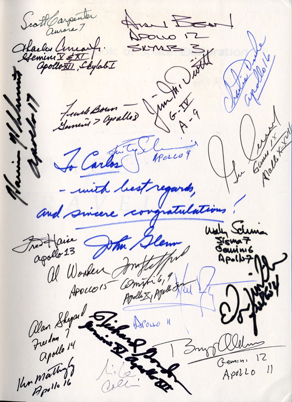 Signed book: Space Travel: The World Book of Space Exploration. Chicago: World Book Inc, 1990. Hardcover, 8.5 x 11, 256 pages. Signed in ballpoint by James Lovell on the inside front cover and by twenty one other astronauts in ink on the opposing first free end page, including: John Glenn (who inscribes to Craig), Neil Armstrong, Buzz Aldrin, Mike Collins, Alan Shepard, Gene Cernan, Charlie Duke, Ken Mattingly, Wally Schirra, Fred Haise, Edgar Mitchell, Frank Borman, Charles Conrad, Alan Bean, Rusty Schweickart, Tom Stafford, Harrison H. Schmitt, Scott Carpenter, Richard Gordon, Jim McDivitt and Al Worden; most have added their various missions. In fine condition, with a bump to the bottom of the spine; the signature page is fine. Amazing collection, impossible to duplicate. COA John Reznikoff/PSA/DNA and RRAuction COA.