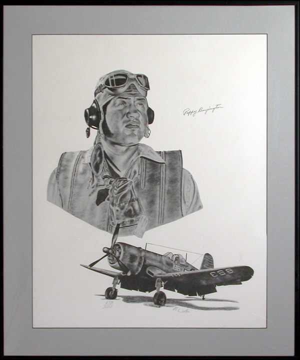 Limited edition 16 x 20 lithograph, numbered number 638/1000, signed in pencil 'Pappy Boyington.' Also signed in pencil by the artist, M. Wooten. Matted and framed to an overall size of 20.5 x 24.5. In fine condition. RRAuction COA. Oversized.