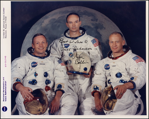 Color 10 x 8 NASA photo of the Apollo 11 primary crew posing in their spacesuits, signed and inscribed in black felt tip to Jess Anderson by Collins. In fine condition. RRAuction COA.