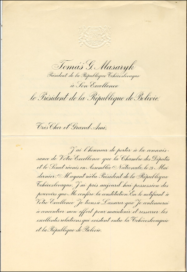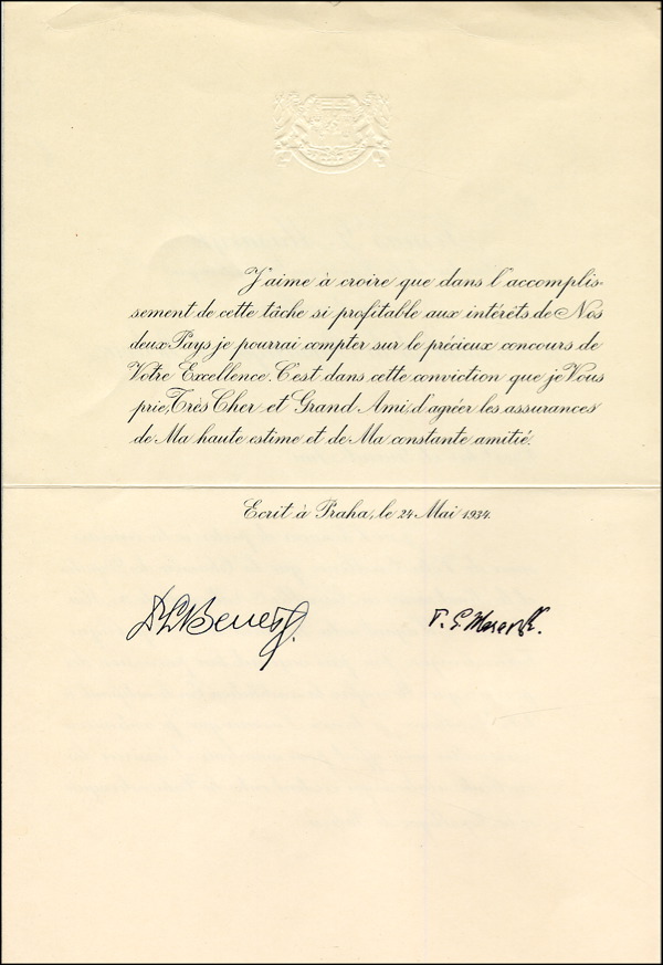 Czech foreign minister. DS, signed 'T. S. Masaryk,' one page both sides, 8.5 x 13, May 24, 1934. Masaryk announces his election to the presidency. Nicely signed on the reverse in black ink. In fine condition, with a touch of light toning and a bisecting horizontal fold. COA John Reznikoff/PSA/DNA and RRAuction COA.