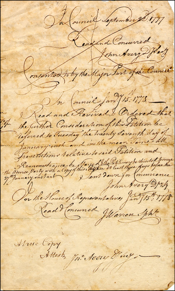 DS, two pages both sides, 7.5 x 12.5, September 18, 1777. Petition to the House of Representatives of Massachusetts for compensation of a lost ship hired by the town of Ipswich to go to the southern states for the purpose of importing grain. Signed at the conclusion by the town's selectmen and John Avery. In very good condition, with scattered toning and spotting, light edge wear and fragile, but intact folds. RRAuction COA.
