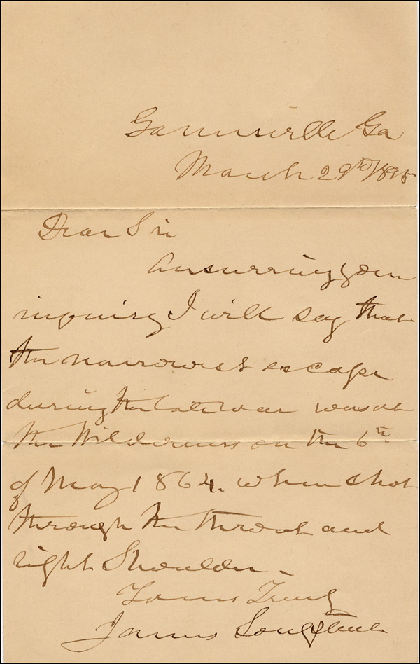 Confederate general who distinguished himself at Bull Run, Fredericksburg, and Chickamauga. ALS, one page, 5 x 8, March 29, 1895. Letter to a gentleman. In full, 'Answering your inquiry I will say that the narrowest escape during the Civil War was at the Wilderness on the 6th of May 1864 when shot through the throat and right shoulder.' Accompanied by the original mailing envelope addressed in Longstreet's hand. In fine condition, with light overall toning and tape reinforcement to folds on reverse. RRAuction COA.