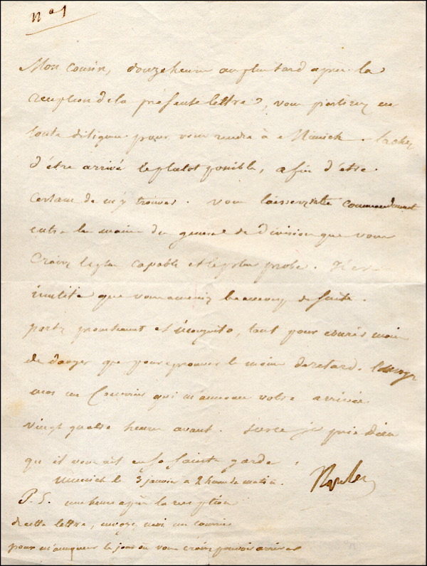 LS in French, one page, 6.5 x 8.5, January 3. Letter to his cousin Eugene. In full, 'Twelve hours at latest after the receipt of this letter you will set off for Munich in all possible haste. Take care to arrive as soon as possible, then you may still find us there. Leave your command with whichever of your divisional generals you consider most capable and honest. It will be useless for you to bring a large suite. Leave at once, incognito, as much to avoid danger as to avoid delays. Send me a courier to announce to me that you will be arriving twenty four hours after him.' The short postscript reads 'One hour after you get this send me a courier with the day of your arrival.' Letter is accompanied by several supporting documents, including a translation of the letter in the book entitled The Princess Auguste, Napoleon's Viceroy, a page from Napoleon and Josephine stating 'Eugene was to leave Italy within twelve hours of receiving Napoleon's letter and to travel to Munich with all possible speed and a 1975 letter from Conway Barker, authenticating the signature. In fine condition. COA John Reznikoff/PSA/DNA and RRAuction COA.