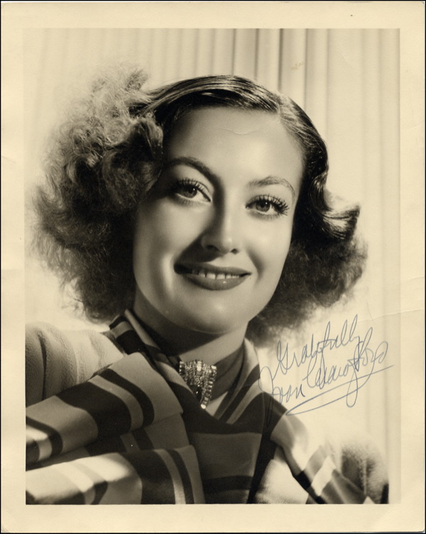 Vintage matte-finish 8 x 10 head and shoulders photo of Crawford from early in her career, signed in fountain pen, “Gratefully, Joan Crawford.” Several surface creases, one lightly affecting sentiment, otherwise fine condition. R&R COA.