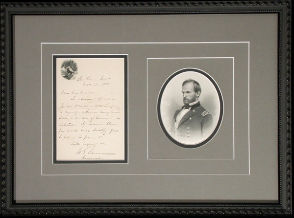 Union general renowned for burning Atlanta during his relentless March to the Sea. ALS signed 'W. T. Sherman, General,' one page, 4.5 x 7, November 13, 1883. Letter to a lady. In full, 'It is simply impossible for me to write a letter satisfactory to myself - without having some subject matter of business as intended. If known these few words will satisfy you, I shall be pleased.' Archivally triple matted and framed with a portrait of Sherman, to an overall size of 19.5 x 14.5. In fine condition, with a bisecting horizontal mailing fold and a minor shade of toning. COA John Reznikoff/PSA/DNA and RRAuction COA.