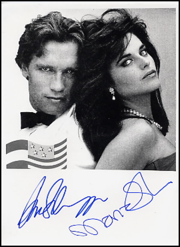 Glossy 5 x 7 photo of the couple, signed in blue felt tip by both Schwarzenegger and Shriver. In fine condition, with a few scattered light creases. R&R COA.