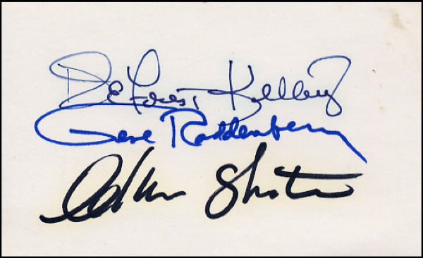 Felt tip signatures, “DeForest Kelley,” “Gene Roddenberry,” and “William Shatner,” on an off-white 5 x 3 card. In fine condition, with light yellow haloing to Shatner signature. R&R COA.
