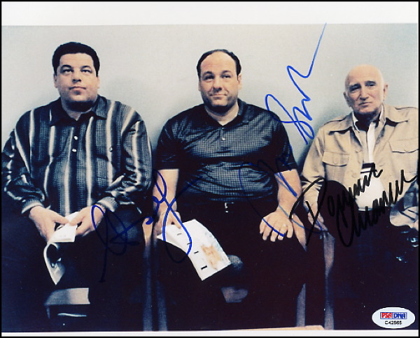 Color glossy 10 x 8 photo, signed in blue felt tip by James Gandolfini and Steve Scrippa and in black felt tip by Dominic Chianese. In fine condition, with a PSA/DNA authentication label discreetly affixed to lower right corner of image. Accompanied by a Certificate of Authenticity from PSA/DNA and R&R COA.