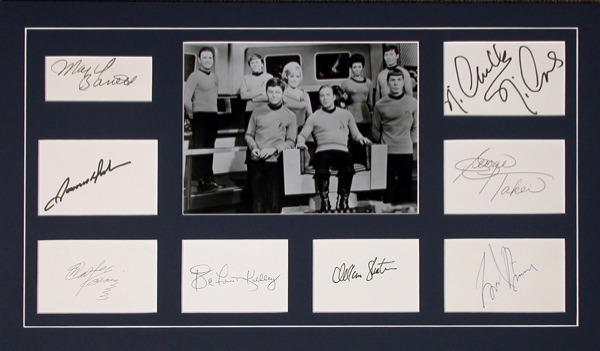 Felt tip and ink signatures of William Shatner. Leonard Nimoy, Deforest Kelley, Nichelle Nichols, James Doohan, Walter Koenig, George Takei and Majel Barrett on individual off-white cards. Matted with a photo of the crew on the bridge of the Enterprise, to an overall size of 23 x 13.5. In fine condition. R&R COA.