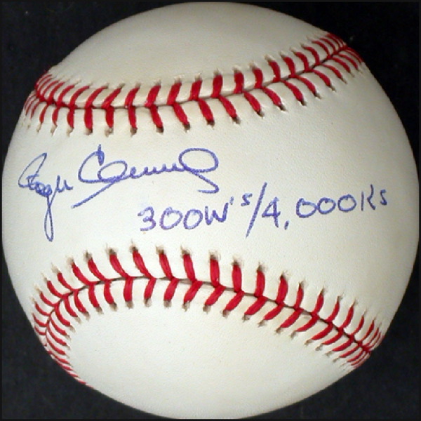 Official Rawlings American League baseball signed in ballpoint on the sweet spot, “Roger Clemens 300 W’s/4,000 Ks.” In fine condition. R&R COA.