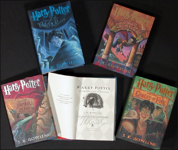 Very nice limited edition boxed set of the first five Harry Potter Books, all hardcover with dustjacket, each signed on the title page in black ink “J. K. Rowling.” Titles are: Harry Potter and the Sorcerer’s Stone, Harry Potter and the Chamber of Secrets, Harry Potter and the Prisoner of Azkaban, Harry Potter and the Goblet of Fire and Harry Potter and the Order of the Phoenix. In fine condition. R&R COA.