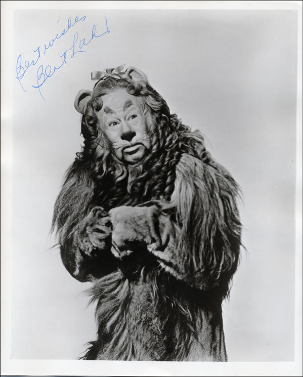Extremely rare and desirable vintage glossy 8 x 10 MGM Wizard of Oz close-up portrait of Lahr as the Cowardly Lion, signed in blue ballpoint, “Best wishes, Bert Lahr.” A few light surface marks and impressions, otherwise fine condition. We’ve only had a couple of these before, which were inscribed, and they both went for over $7,000. This one, being uninscribed, is perhaps more desirable…but in any case, signed photos of Lahr as the Cowardly Lion are virtually nonexistent! PSA/DNA COA and R&R COA.