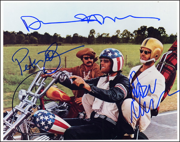 Classic color glossy 10 x 8 photo from the film, signed in blue felt tip by Jack Nicholson, Peter Fonda and Dennis Hopper. In fine condition. R&R COA.