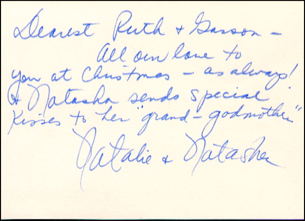 ALS signed “Natalie & Natasha,” one page, 5.25 x 3.5, no date. Brief Christmas letter to the Kanins on her monogrammed stationary. She has signed for herself and Natasha, with Wood having thrown Gregson out of the house earlier. Accompanied by the original envelope, with “N. Wood,” written on the reverse above return address. In fine condition. R&R COA.