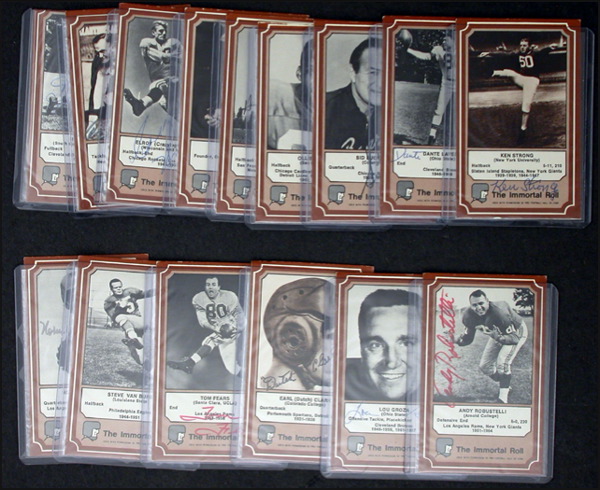 Lot of fifteen different football trading cards issued by Fleer entitled The Immortal Role, each signed on the front in ink or felt tip by the respective player pictured: Groza, Clark, Fears, Van Buren, Van Brocklin, Strong, Lavelli, Luckman, Matson, McElhenny, Halas, Hirsch, Hubbard, Motley and Robustelli. In fine condition. R&R COA.