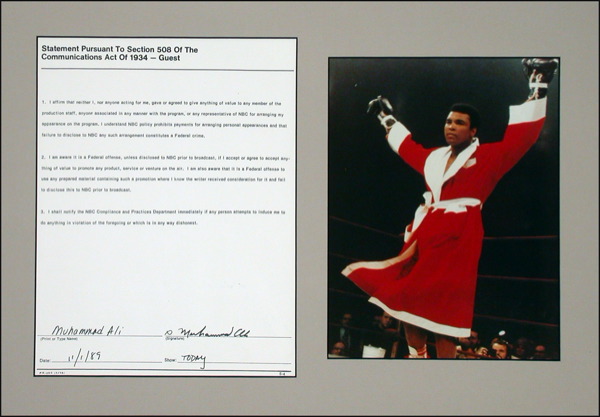 DS, one page, 8.5 x 11, November 1, 1989. Document signed as a guest on the NBC morning show Today, stating he did not give or receive gifts or make arrangements in order to appear on the show. Signed at the bottom in black ink by Ali, who also prints his name. Double matted with a color photo, to an overall size of 19 x 13. In fine condition. COA Steve Grad/PSA/DNA and R&R COA.