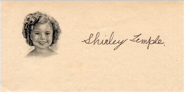Vintage fountain pen signature as a child, “Shirley Temple,” on an off-white 5.5 x 3 slip, which also bears her printed image. In fine condition. R&R COA.
