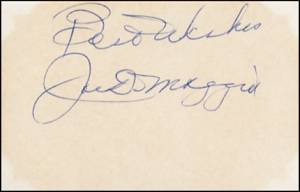 Ballpoint signature, “Best wishes, Joe DiMaggio,” on an off-white 3.5 x 2.25 card. In fine condition, with light overall toning from previous display. COA Steve Grad/PSA/DNA and R&R COA.