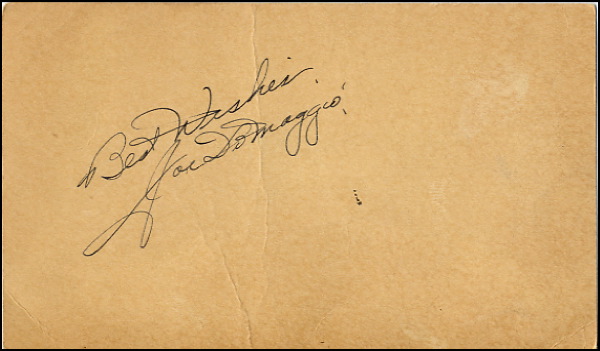 Vintage ink signature, “Best wishes, Joe DiMaggio,” on the reverse of an off-white 5.5 x 3.25 postcard postmarked 1940. In fine condition, with a couple light surface creases and even overall toning. COA Steve Grad/PSA/DNA and R&R COA.