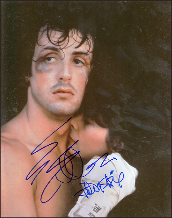 Color glossy 11 x 14 photo of Rocky and Adrian, signed in blue felt tip by Sylvester Stallone and Talia Shire. In fine condition. R&R COA.