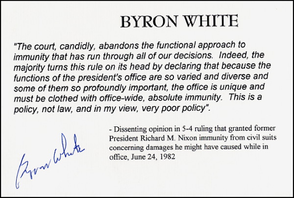 TQS on a 6.25 x 4.25 card. A quote from the dissenting opinion in the ruling which granted Richard Nixon immunity from civil suits. In part, “The office is unique and must be clothed with office-wide absolute immunity. This is a policy, not law, and in my view, very poor policy.” Signed in the lower left in blue ink by White. In fine condition. R&R COA.