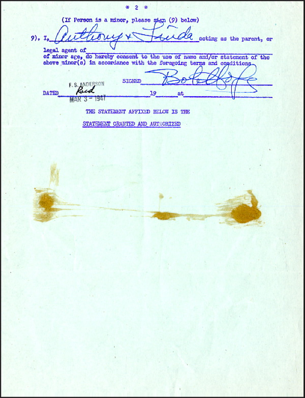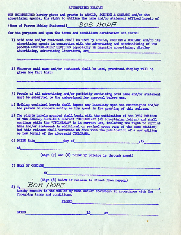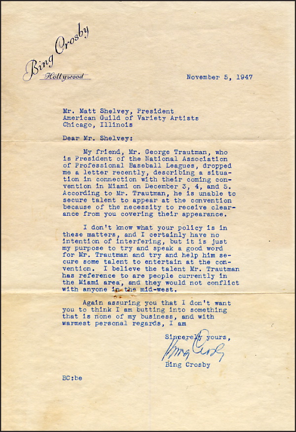 TLS, signed “Bing Crosby,” one page, dated November 5, 1947 on his personal letterhead. Crosby writes to the President of the Variety Artists Guild on behalf of a friend. In part, “It is just my purpose to try and speak a good word for Mr. Trautman and try to help him secure some talent to entertain at the convention.” Also included is a two page signed document, signed on the second page by Hope, with a stamp date of March 3, 1947. In very good condition, with expected folds, scattered soiling and spotting and staple holes to document. R&R COA.
