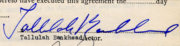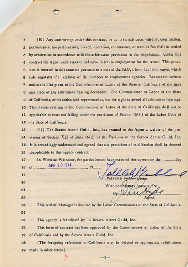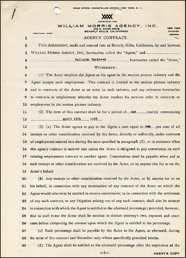 DS, eight pages, 8.5 x 12, William Morris Agency letterhead, April 10, 1944. Standard one year agency contract between the William Morris Agency and Bankhead for the standard ten percent commission, boldly signed on the last page in blue ink by Bankhead. In fine condition, with staples and punch holes to top edge and some light page toning. R&R COA.