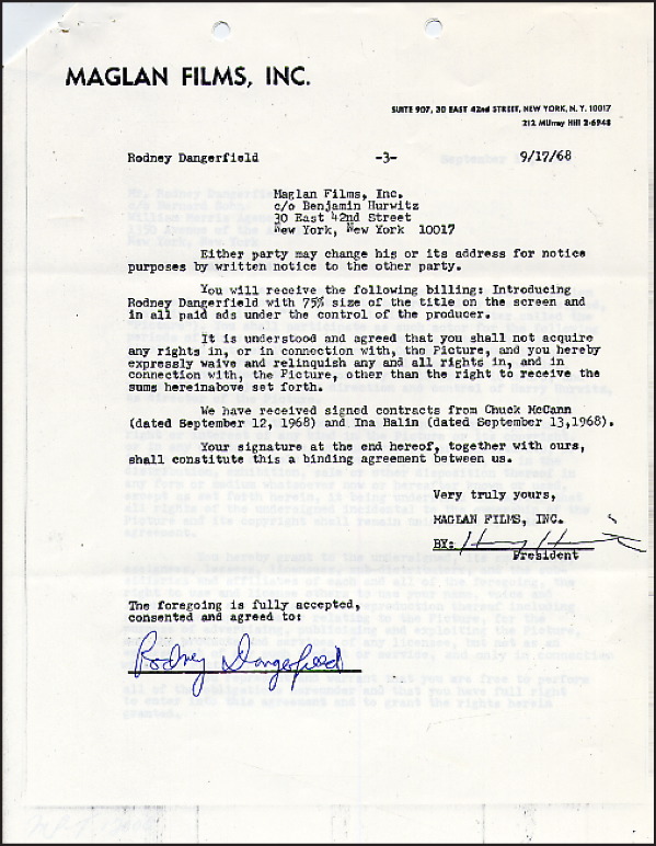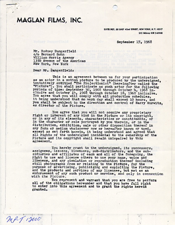 DS, three pages, 8.5 x 11, Maglan Films, Inc. letterhead, September 17, 1968. Agreement between Maglan Films and Dangerfield for Dangerfield to appear in the film entitled The Projectionist for the salary of $1000 for ten days work. As this was Dangerfield’s first film appearance. Provisions are made in the contract for billing as “introducing Rodney Dangerfield.” Signed at the bottom of the last page by Dangerfield. In fine condition, with expected holes and notations. R&R COA.