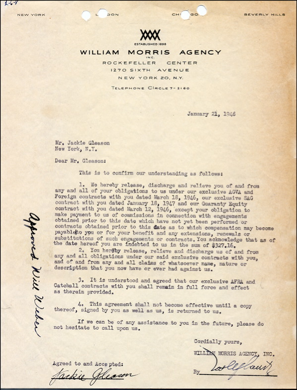 DS, one page, 8.5 x 11, William Morris Agency letterhead, January 21, 1948. Agreement between Gleason and the William Morris Agency to void several of his agreements, however keeping their AFRA and Catchall contracts in full force. In fine condition, with punch holes to top, light overall toning, a bit heavier to right edge and an ink endorsement to left side. R&R COA.