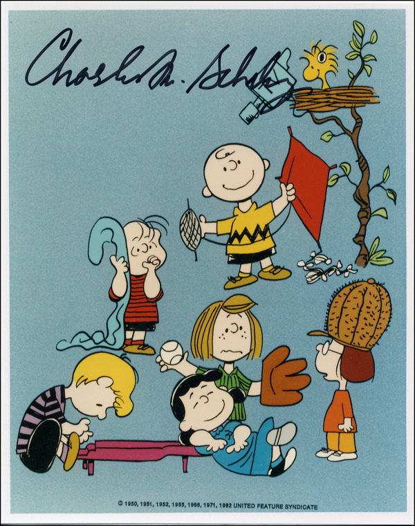 Great color glossy 8 x 10 photo of seven Peanuts characters, including Charlie Brown, Linus and Peppermint Patti, signed across the top in black felt tip, “Charles M. Schulz.” In fine condition. R&R COA.