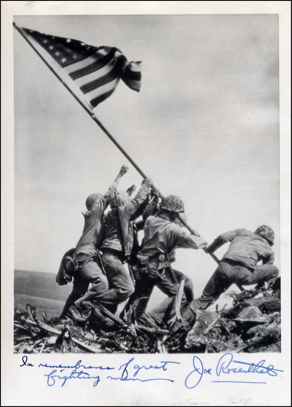 Vintage 5 x 7 photo of Rosenthal’s historic photo of the Iwo Jima flag raising, signed in the lower border in fountain pen, “In remembrance of great fighting men, Joe Rosenthal.” In fine condition, with small collector’s notation to bottom edge and some light rippling. R&R COA.