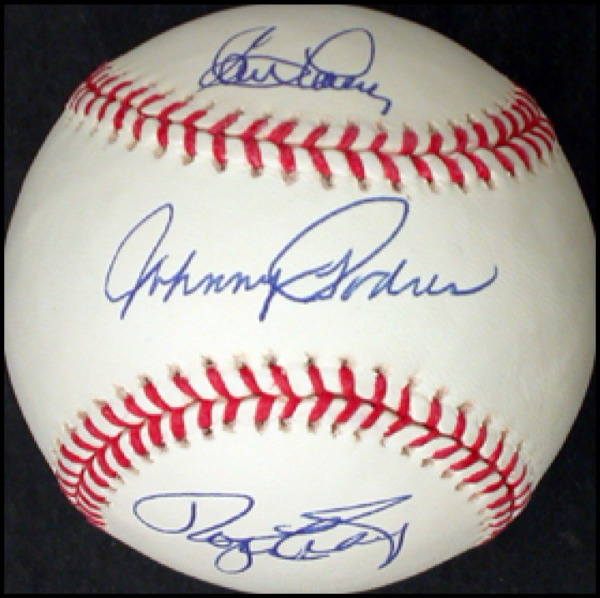 Official Rawlings National League baseball signed in ballpoint by the three Dodger pitchers responsible for all four 1955 World Series victories. Signed on the sweet spot by Johnny Podres and on the side panels by Roger Craig and Clem Labine. In fine condition. R&R COA.