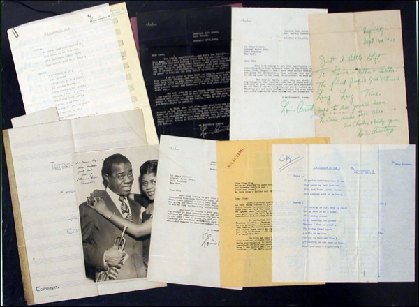 Fabulous archive of Jazz legend Louis Armstrong mentoring an aspiring singer/songwriter with four signed letters, including one autographed letter signed "ricely and chickenly yours, Louis Armstrong." The letters were mainly written in the late 40s when Armstrong was coming off of his most grueling tour schedules. He formed Louis Armstrong and His All Stars. The band, which had a rotating cast of "all stars," first included Jack Teagarden, Barney Bigard, Earl Hines, and Big Sid Catlett. The Archive includes: An autographed letter signed in green pen written from Bop City and dated Sept. 14th, 1949. Armstrong writes in full, "Just a little gift to Gina + Mother + Father. The finest people I've met in a long long time. Hope to see you all soon. Lucille sends love also. Am chicken + Ricely yours, Louis Armstrong." A typed letter signed from Armstrong on yellow "Satchmo" stationery from Fox Theatre in Detroit, Mich. Dated September 17th, 1949. In full the letter reads, "Gina Gina Gina, we're so glad we've seen her, and between Lucille and I, Don't you know? We love Gina's Mother and Father also. Dear Gina: Just finished reading your very fine letter (as usual) and am very happy indeed to know that you and your very lovely family still thinks we're (Lucille and I) are still O.K…of course you all know that we feel the same exact way about you and your family also…We opened here yesterday and the show we're in is very nice and doing real great…We will be here for one week . . . then we will go to Washington, DC to play at some night club there for one week also. It certainly did make me feel very bad to hear you're not feeling so well…because you're always vivacious, etc., which I admire in you greatly . . . So hurry up and get welll [sic] 'You hear?…'Nay Nay…We won't have that…Lucille is not with me…She stayed home until we return…She's so busy getting ready for her trip to Europe …Oh yess [sic]-she's all up in the air over it …I'm happy for her…So Gina my dear - take it easy - and I'm sure everything will turn out alright for you…the most you need is some rest …Maybe you've been going too much…So please remember rest is very important in show business…Love to mama and Papa…Also tell Mama I can hardly wait to get another enchore [sic] of her good good good cooking…'Yea Man' …Am ricely and chickenly yours, Louis Armstrong." A typed letter signed to Mr. Abner Silver of Lincoln Music Corp. dated November 17th, 1950 from Standish Hall Hotel in Hull Quebec, Canada. The letter is typed on ivory "Satchmo" stationary. In full, the letter reads, "Dear Sir; Have been trying to get this opportunity to write you concerning Miss Gina Gardner's tune, On the Train, or the new name, Grand Canyon' - but I have been busier than a 'one leg man going to the Charleston…Gina tells, me that you're willing to add my name to the tune, which pleases me greatly…The tune is really a good one, and should do real big things in this country…You can go ahead and count me in and send me some copies…And you can rest assured-that I will do all that I can to swing it, and put it before my public…Thank you and Miss Gardner very much for even considering me…And regards to Miss Gardner and her wonderful family. I am trumpetly yours, Louis Armstrong." An autographed letter signed to Miss Gina Nirova at the Wellington Hotel in New York postmarked from Syracuse, NY August 12, 1950. Armstrong writes in green pen, "Howdy folks, am still thinking of you + your very lovely family. Will see you soon. Regards, Louis Armstrong." The letter is written on a postcard featuring Armstrong's picture on the front. An 8 x 10 black and white photo of Louis and Lucille Armstrong presumably signed and inscribed by Lucille. Several copies of lyrics and music to Gina Gardner songs. In fine condition. R&R COA.