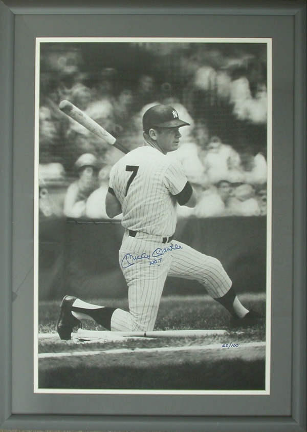 Outstanding 20 x 30 limited edition photo, #62/100, signed in blue felt tip, “Mickey Mantle No. 7.” Double matted and framed to an overall size of 26.25 x 36.5. In fine condition. Accompanied by a copy of a COA from PSA/DNA (item was part of a group lot), COA Steve Grad/PSA/DNA and R&R COA.