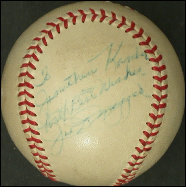 Official Reach American League baseball (Harridge), signed and inscribed in ink on a side panel, “To Jonathan Kamber, With best wishes, Joe DiMaggio.” In very good condition, a light shade of toning to ball and signature and inscription light, but legible. COA Steve Grad/PSA/DNA and R&R COA.